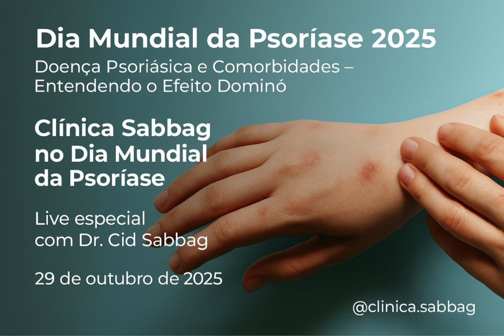 Dia 29 de outubro de 2025 iremos programar uma live na internet transmitido pelo Instagram clinica.sabbag 🌍 Dia Mundial da Psoríase 2025🧩 Tema global: “Doença Psoriásica e Comorbidades — Entendendo o Efeito Dominó”✨ Clínica Sabbag no Dia Mundial da Psoríase A psoríase vai muito além da pele — afeta o corpo e a mente.No dia […]